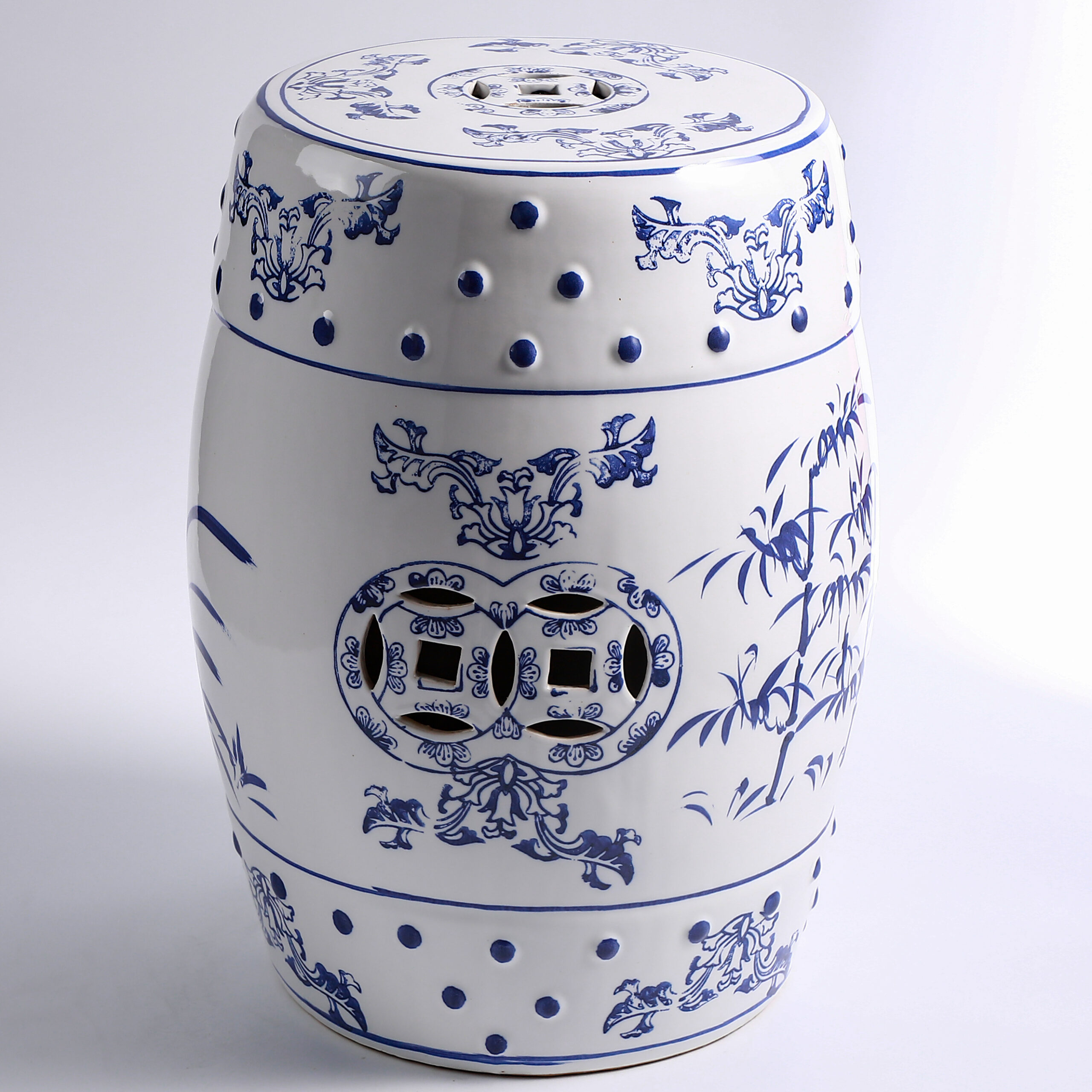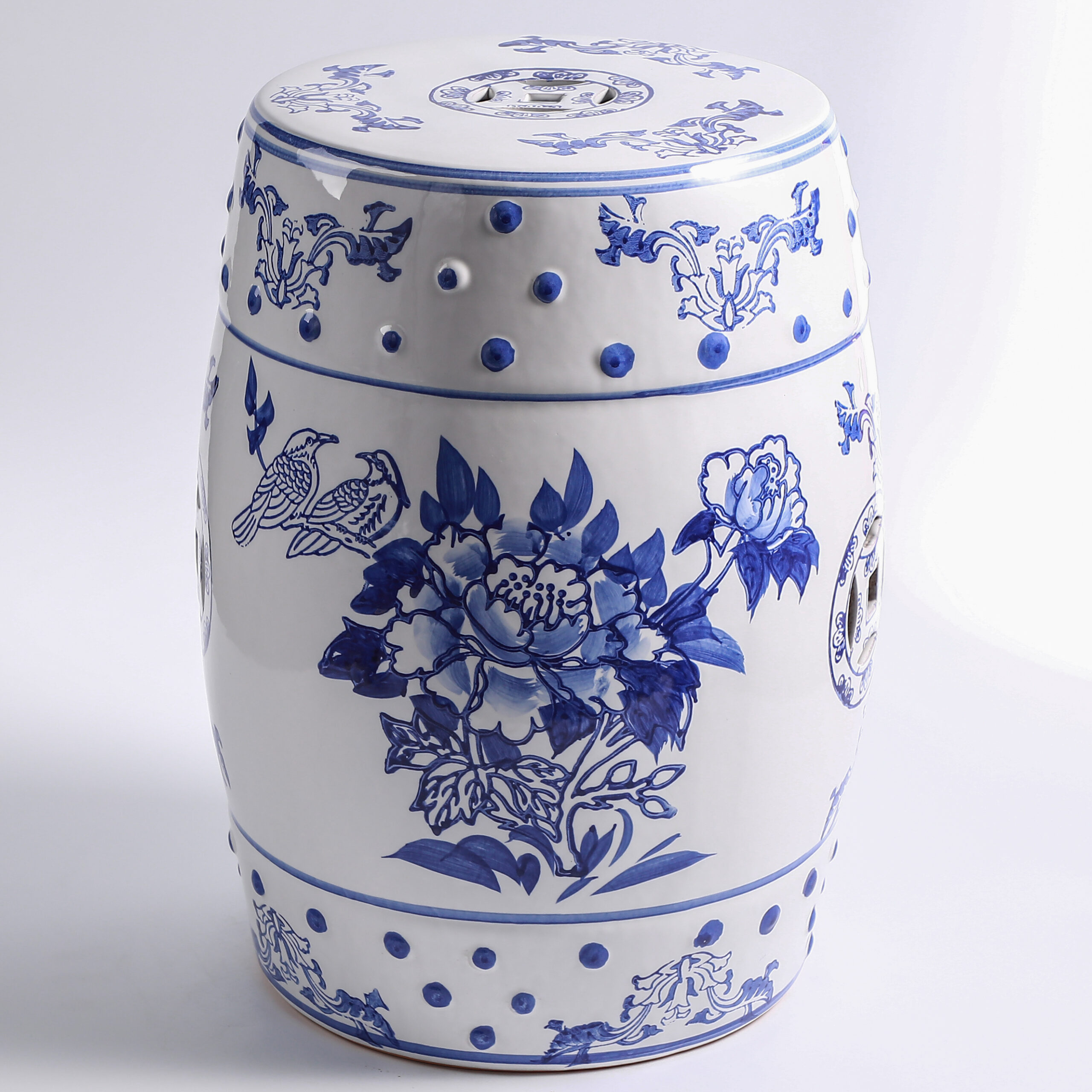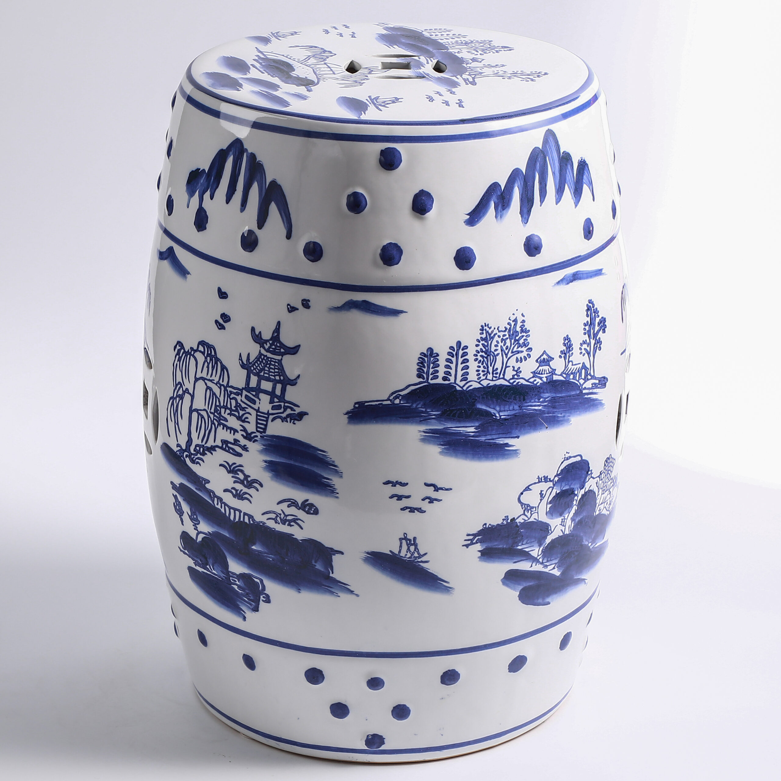 Elevate your space with this exquisite blue and white porcelain garden stool. Featuring a classic drum shape adorned with hand-painted landscapes of pavilions, rivers, and mountains, this stool blends traditional Chinese art with functional design. Perfect as a decorative accent, a practical side table, or a plant stand, it brings timeless oriental elegance to your home, garden, or patio.