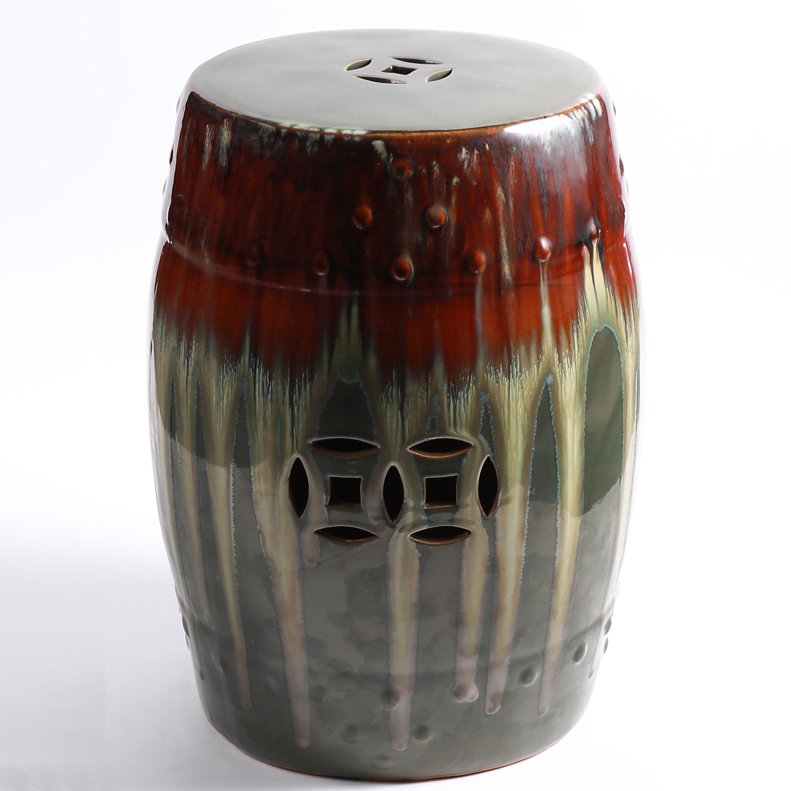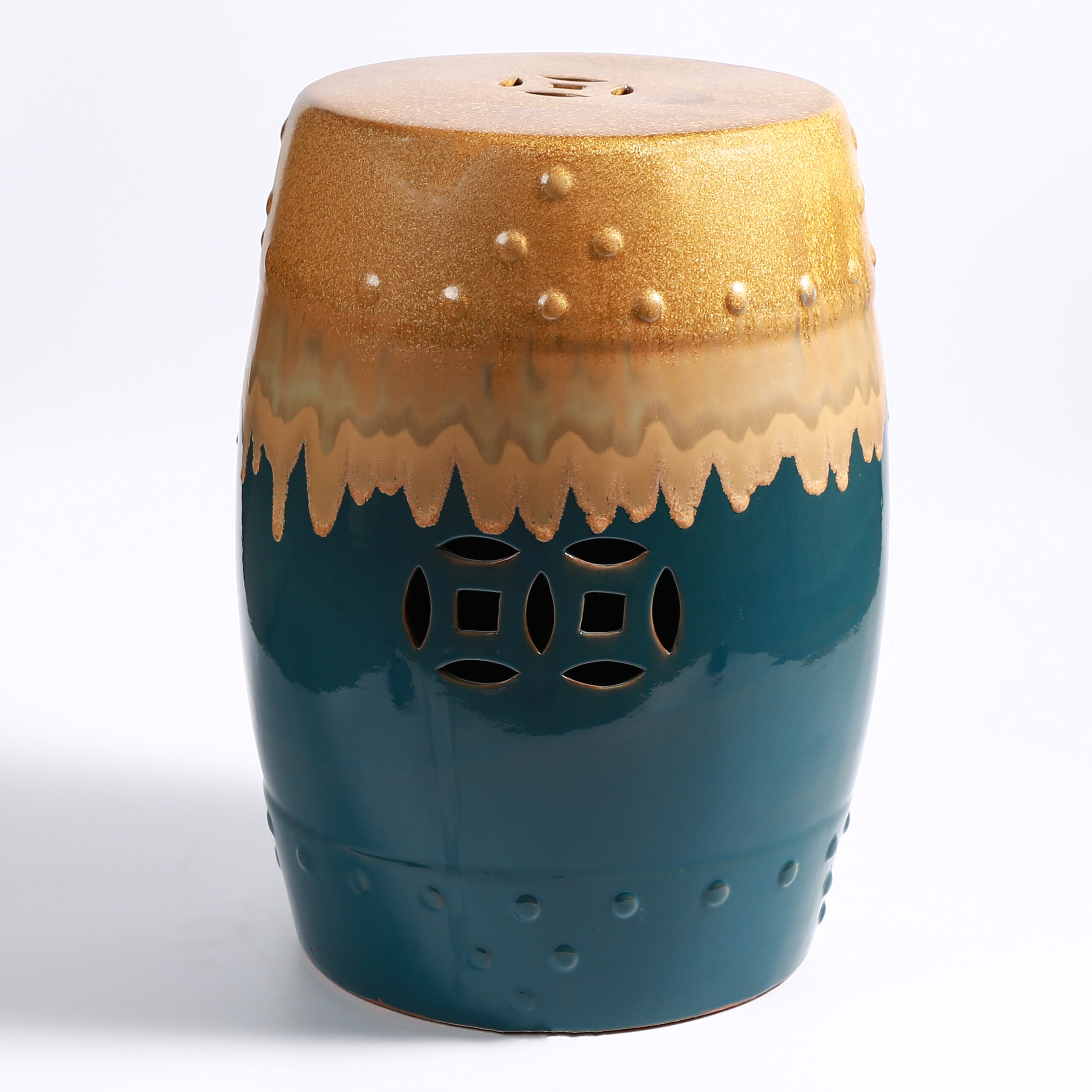 Handcrafted ceramic drum stool with traditional coin cutout and raised stud details. Features stunning gradient glaze in multiple vibrant hues, perfect for extra seating, a side table, or plant stand. Durable, weather-resistant, and ideal for both indoor and outdoor decor.