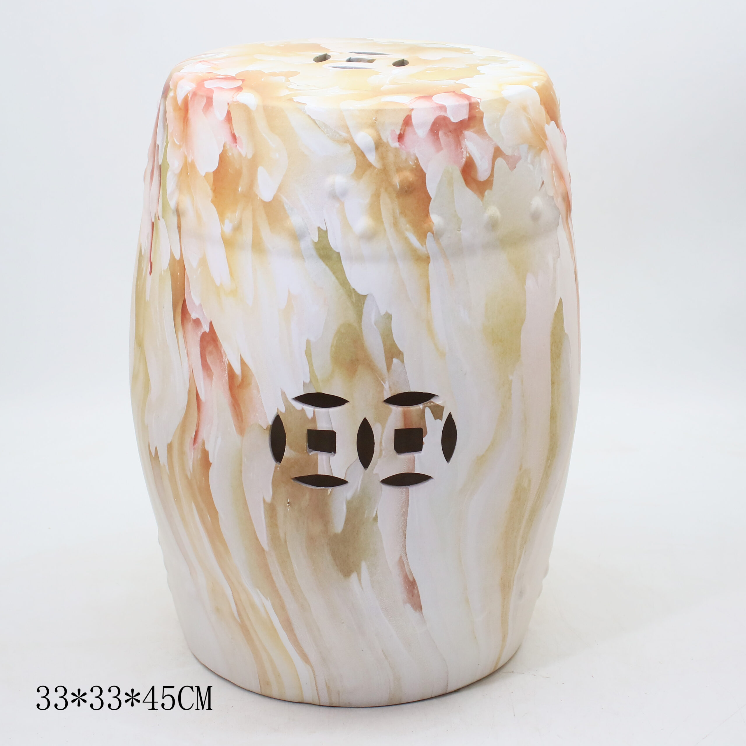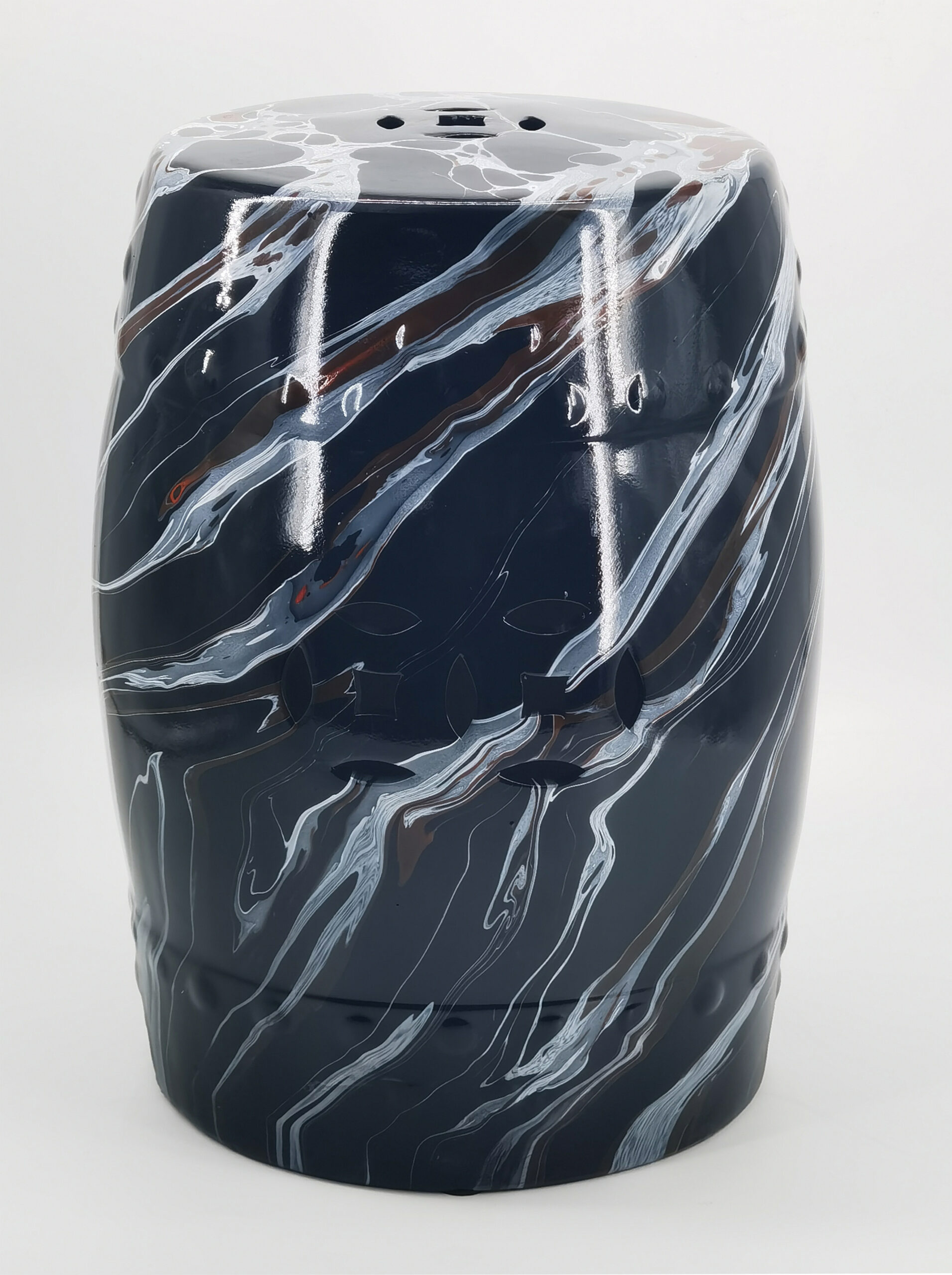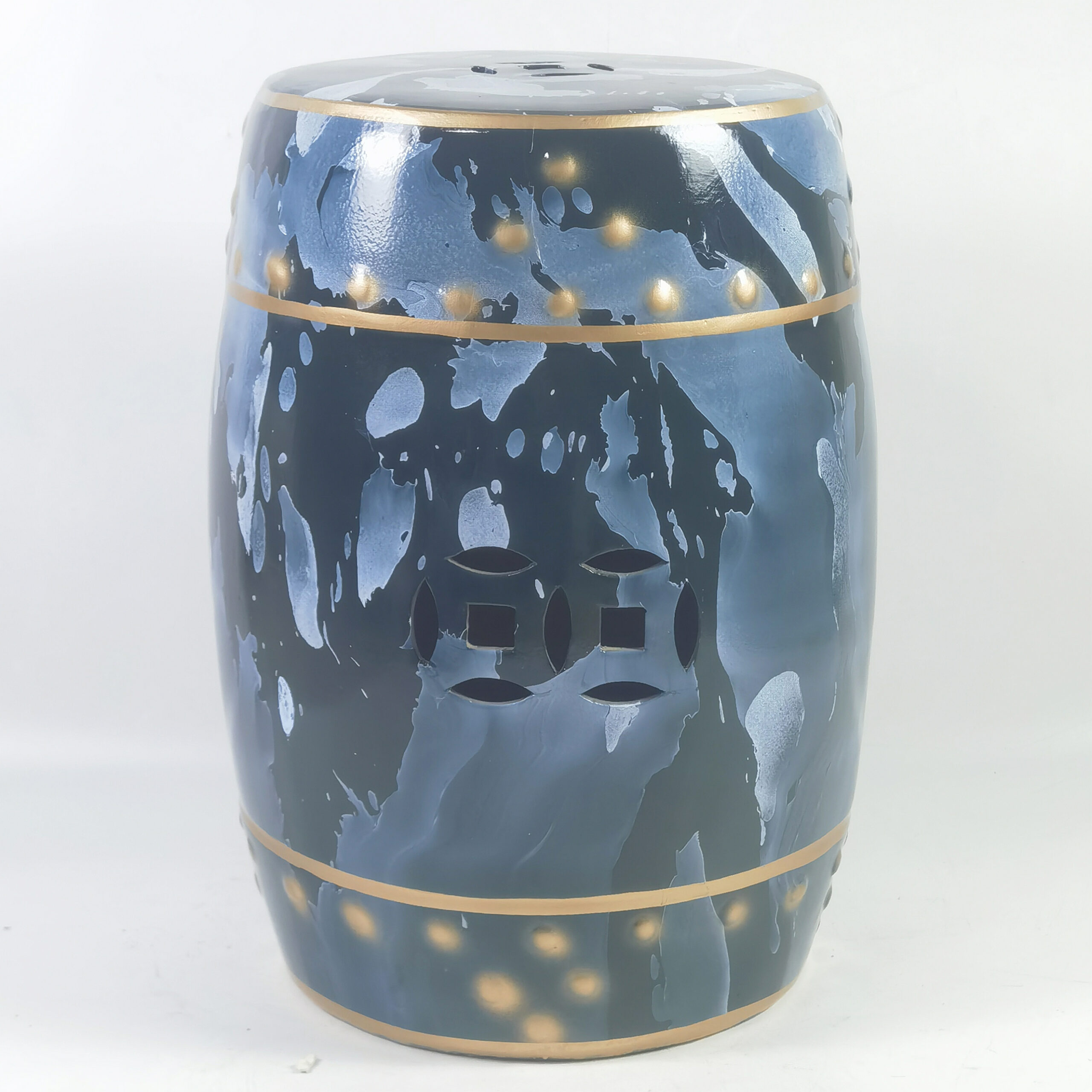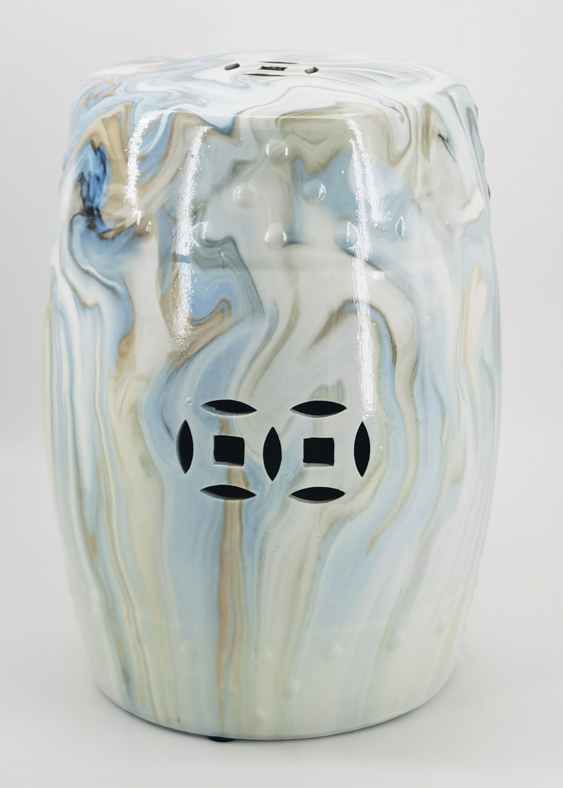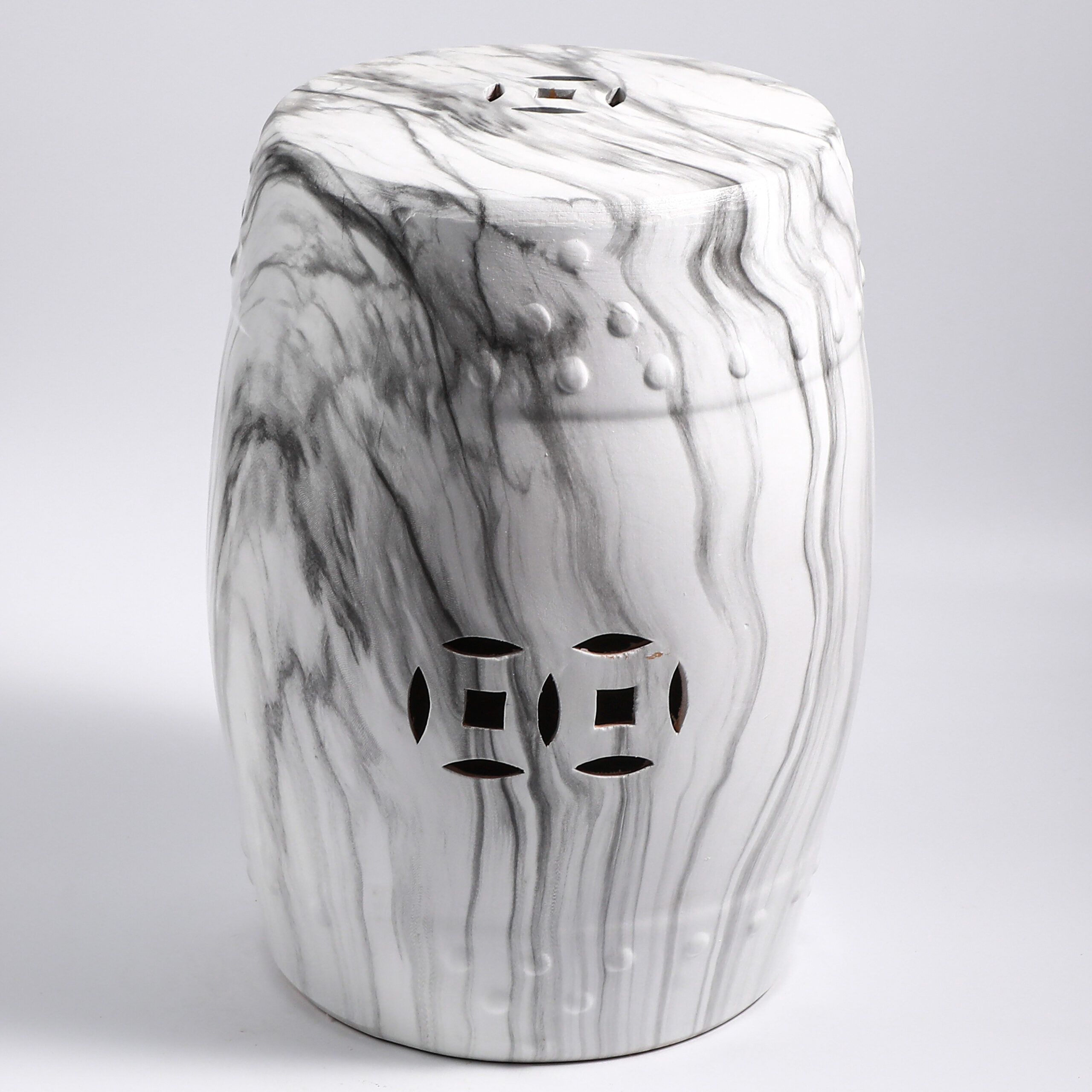 Classic drum-shaped ceramic stool with elegant marble texture glaze, raised stud details and traditional coin cutout design. Durable and multi-functional, it serves as seating, side table or plant stand, bringing refined artistic charm to indoor and outdoor spaces.